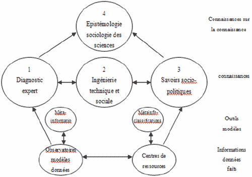 Les acteurs (administratifs, associations, professionnels, etc.) qui attendent des enseignements de la part de la recherche génèrent aussi des savoirs spécifiques : documents méthodologiques, évaluations, expériences de terrain… On peut aussi rattacher à cet ensemble (3) les « connaissances vernaculaires », autochtones, reconnues spécifiquement dans le document d’Action 21 de Rio.