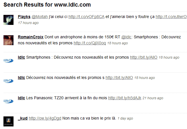 Ces outils permettent de simplifier la veille en affichant automatiquement (ou via un mail journalier) ce qui se dit sur un mot clé donné. Par exemple, sur l’image ci-dessus, nous pouvons voir les derniers articles publiés qui parlent de LDLC. Il existe aussi ce genre d’outils pour Twitter :