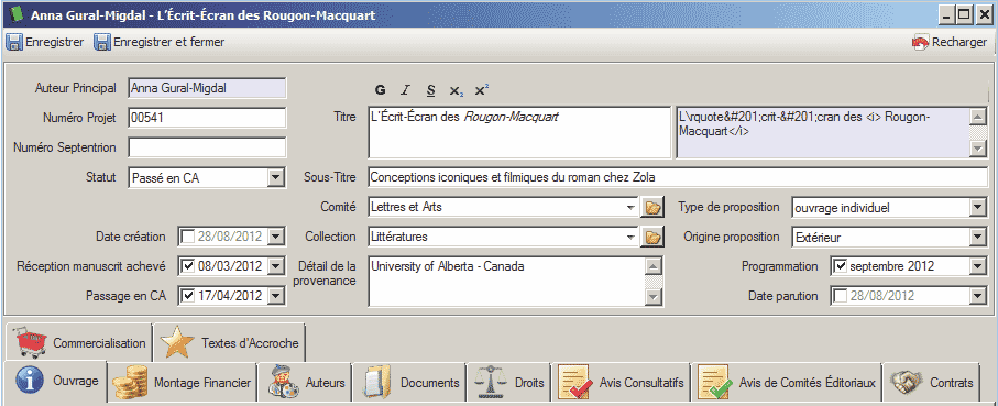 Cet éditeur a développé une chaîne traditionnelle papier dont les ouvrages publiés sont très bien promus, autant sur le Web que sur le terrain, grâce au service communication/presse. Les Presses universitaires du Septentrion ont eu leur propre site Internet dès 1995 <http://www.septentrion.com/>. Elles ont donc choisi de ne pas passer directement par une plate‐forme pour faire connaître leurs ouvrages, mais de développer un site entièrement dédié à l’éditeur et à ses publications. Le site a été remanié en 2011 et offre aux internautes de multiples possibilités. Le lecteur a plusieurs choix de recherche, il peut visualiser en partie un ouvrage qu’il peut acheter sur le site, il peut partager un ouvrage sur les réseaux sociaux ou réagir directement en rédigeant un commentaire. Le site est régulièrement mis à jour, notamment vis‐à‐vis des nouveautés publiées chaque mois, ce qui amène les internautes à y retourner régulièrement. Les métadonnées téléchargeables des ouvrages sont écrites sous Onix, ce qui est très important pour leur interopérabilité avec d’autres plates‐formes car Onix est le standard international d’échange des métadonnées dans l’industrie du livre2. Développé depuis 2000 par EDItEUR, groupe international de développement de standards pour le commerce électronique du livre et d’e‐book, Onix est basé sur le XML et propose plus de 450 balises de description de contenu3. Les métadonnées des ouvrages publiés par cet éditeur sont ainsi disponibles sur d’autres bases de données telles qu’Electre, la Bibliothèque nationale de France, the British Library, the Library of Congress, place des librairies, Lybfly, Livres Hebdo ou encore Google Books. Les métadonnées sont un enjeu fondamental pour le livre numérique car ce sont grâce à elles que l’internaute va trouver l’ouvrage sur le Web et l’acheter ou le consulter.
