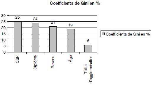Régis Bigot regroupe les critères les plus discriminants dans l’accès aux nouvelles technologies en les classant par le coefficient de Gini61.