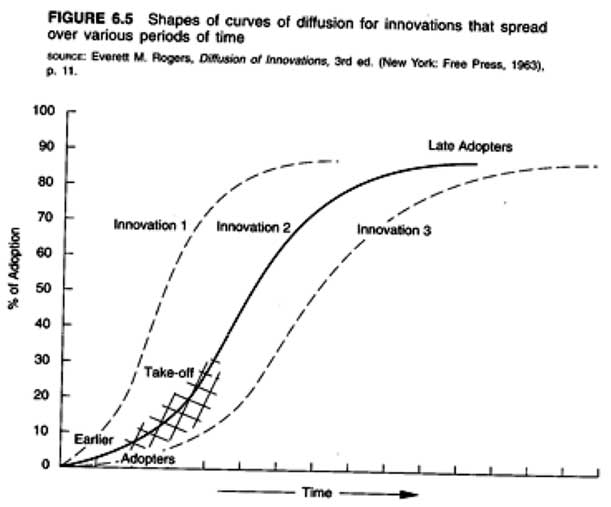 En parlant de « primo-adoptants » (ou premiers adeptes), Fabrice Le Guel et Thierry Pénard font référence à la courbe de Rogers datant de 1962 et représentant le rythme de diffusion des innovations.