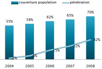 Figure 12. Evolution de la couverture et de la pénétration du réseau 3G en France. Sources: Arcep (2006), Forrester Reseach (2005)