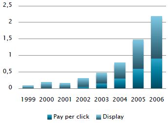Au moment de la création des sites de la presse en France, le marché de la publicité fonctionnait avec des campagnes payées au coût par mille (CPM) à un prix suffisamment élevé pour provoquer la ruée que l’on a constaté dans la première partie. Aujourd’hui, plusieurs évolutions ont remis en cause ce système de publicité, poussant les éditeurs de sites à trouver des solutions innovantes. Le marché de la publicité a tout d’abord été fortement perturbé entre 2000 et 2002. L’arrivée de Google ensuite et le développement des campagnes au coût par clic (CPC), voire au coût par action (CPA) depuis 2007, a encore fragilisé la position des sites d’actualités sur le marché de la publicité. En effet, les campagnes au CPC et au CPA prennent la forme de liens sponsorisés générés en fonction du contexte, pour lesquels les sites perçoivent un revenu en fonction du nombre de clics ou d’actions réalisées. Ces campagnes, convenant particulièrement au marketing direct du fait de la finesse du ciblage, permettent aux annonceurs de gérer plus efficacement leurs budgets de communication et de mieux évaluer la rentabilité des investissements publicitaires consentis, ce qui explique leur forte croissance puisque le CPC est passé de 1% de part de marché en 2001 à 42% en 2006, comme le montre la figure 15 ci-contre.