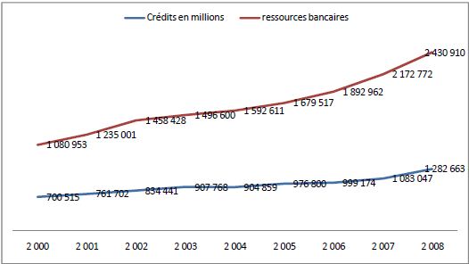 | Année | Montant de crédits en millions de FCFA | Ressources bancaires en millions de FCFA |