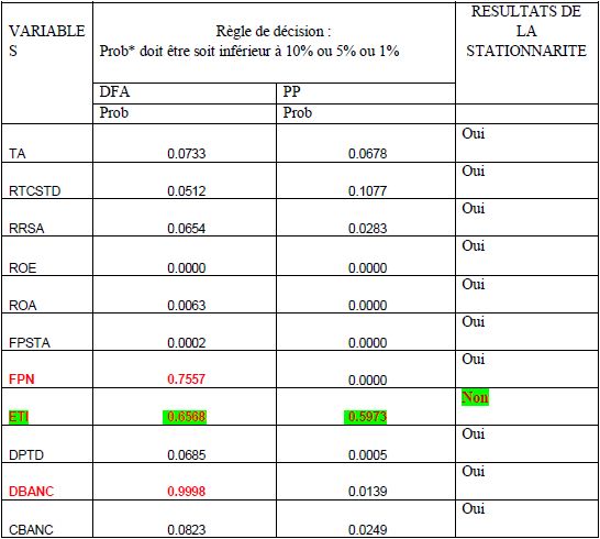 Ces tests sont faits pour les raisons de non stationnarité de trois de nos variables : ETI, DBANC, CBANC. Ces variables restent toujours non stationnaires, d’où le test de stationnarité de DFA et PP avec trend et constante.