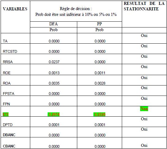 Ces tableaux permettent de faire ressortir les variables stationnaires avec le test de DFA et PP à niveau c’est-à-dire cointégrées (voir annexe 1). Au regard des tableaux ci-dessus, on peut constater que toutes nos variables sont stationnaires dans le test de DFA et PP avec trend et constante sauf la variable ETI.