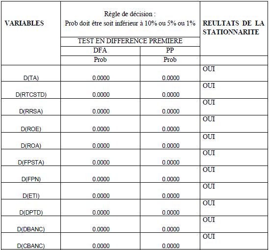 On peut constater que toutes nos variables sont stationnaires en différence première avec le test de DFA et celui de PP