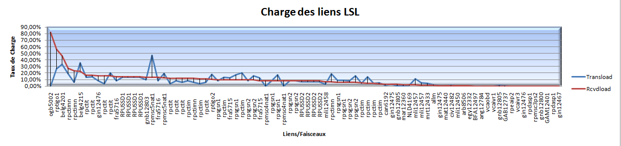 Dans le cas de la détermination du taux d’occupation des liens sémaphore, nous avons sélectionnés les cinq premiers faisceaux les plus chargés dans le réseau pour l’évaluation du taux d’occupation des liens. Les deux tableaux suivant résument en termes d’occupation les liens LSL et HSL. Les calculs sont effectués dans les deux sens, le taux d’occupation en émission et le taux d’occupation en réception. En se basant sur les recommandations déjà discuté dans les paragraphes précédents, nous pouvons maintenant savoir combien en pourcentage un lien est occupé en émission et en réception. Pour ce faire nous avons choisi parmi les liens en forts trafic le compteur (MOCTTRAN) désignant les messages transmis exprimé en octet et le compteur (MOCTRCV) pour les messages reçus, pour déterminer la charge en pourcentage de ces liens. Sachant que le débit d’un canal sémaphore est de 64kbps ainsi que le codec utilisé est le G.711, nous allons se référer pour tous ces paramètres pour calculer la charge des liens.