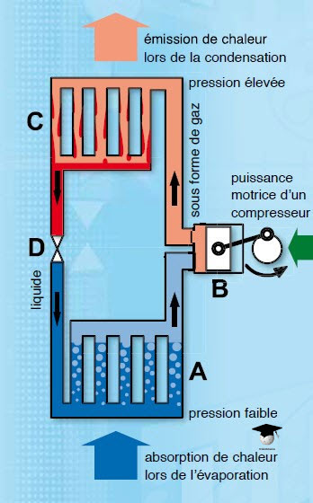 La majorité des installations frigorifiques opèrent selon le principe de la compression mécanique des vapeurs : les vapeurs surchauffées produites au cours d’un processus isobare dans l’évaporateur A, sont aspirées à basse pression et température basse par le compresseur B.