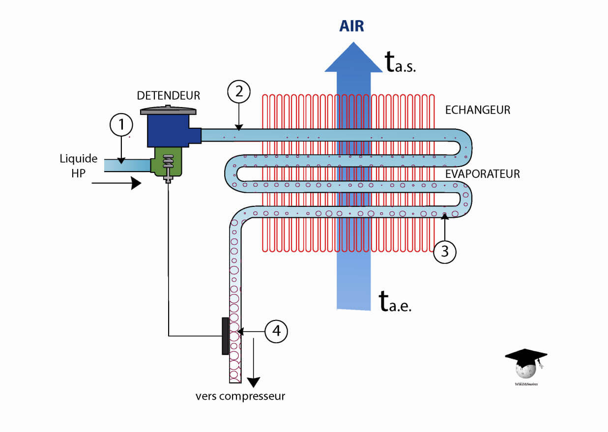 En passant dans ce dernier, le fluide frigorigène va se vaporiser partiellement et voir sa température baisser.