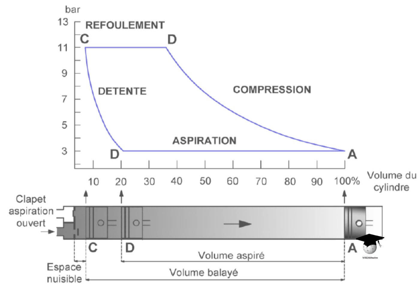 La distance DA correspond à la course réelle de l’aspiration et de compression. Ce qui veut dire, à chaque tour de vilebrequin, le compresseur va réellement aspirer un volume de vapeur correspondant au volume compris entre D et A.