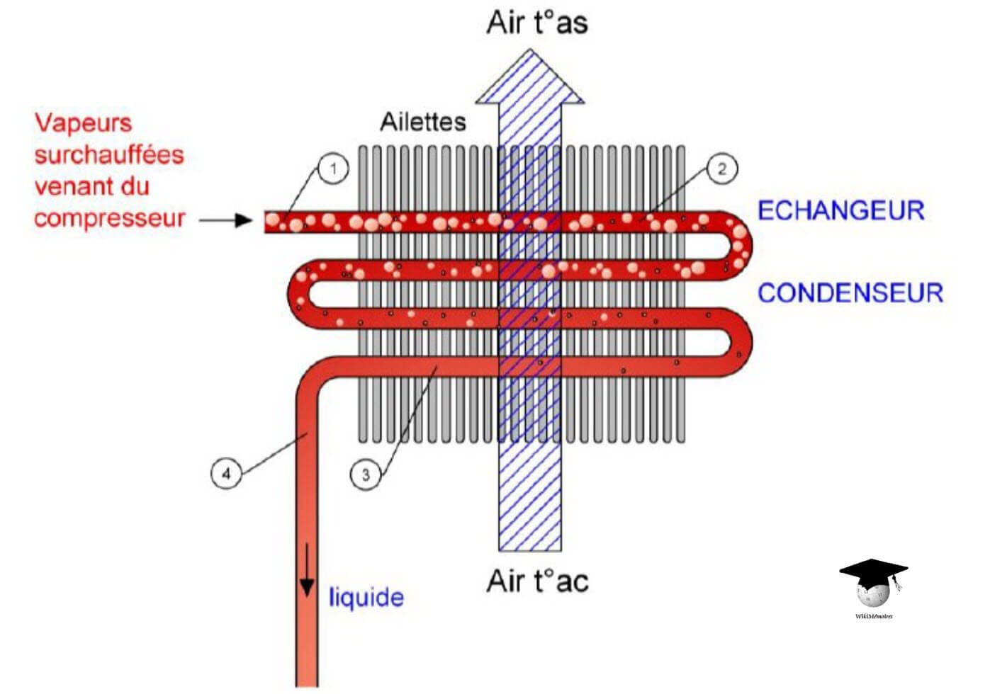 Le gaz chaud du réfrigérant cède sa chaleur à l’air traversant le condenseur et passe à l’état liquide. L’avantage du condenseur à air est que son entretien est limité, et il n’y a aucun risque de gel.