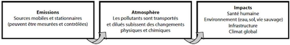 Dès que les polluants pénètrent dans l’atmosphère, ils subissent des changements physiques et chimiques avant d’atteindre un récepteur. Ces polluants peuvent provoquer des effets graves sur la santé humaine et sur l’environnement (Figure 6).