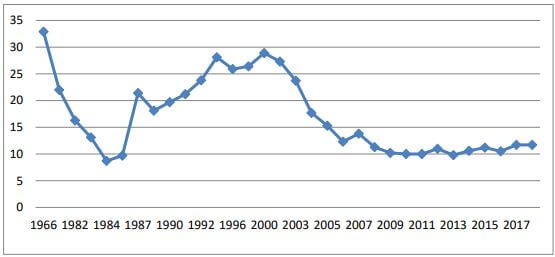 Graphe N°1, évolution du taux de chômage entre 1966 au 2017