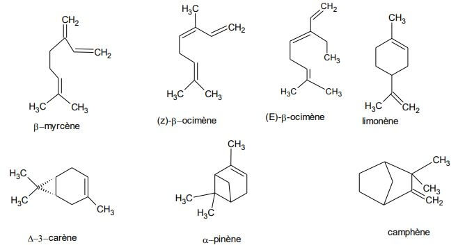 Ces composés peuvent être : monoterpènes acycliques (myrcène, ocimènes), monoterpènes monocycliques (α- et γ- terpinène, p-cymène) et monoterpènes bicycliques (pinènes, Δ3-carène, camphène, sabinène).