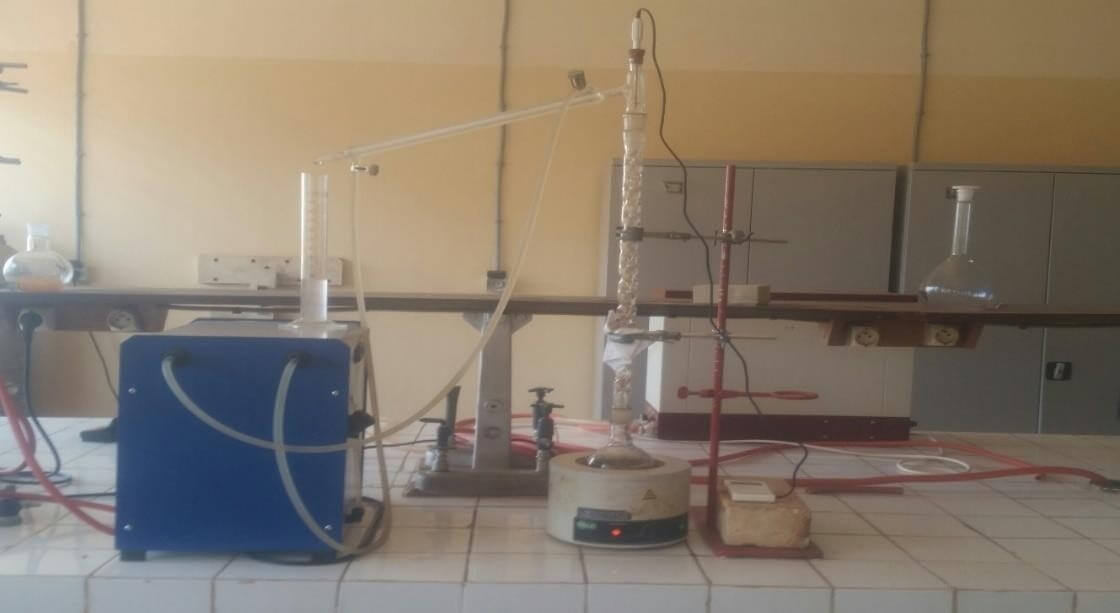 Peser 2 g de l’huile essentielle à analyser que l’on introduit dans un ballon rond puis y ajouter 6 ml du mélange éthanol-éther de pétrole (1 :1), et 25 ml de la potasse alcoolique 0,5 N, porter le mélange à l’ébullition sur un bain marie pendant 1 heure.