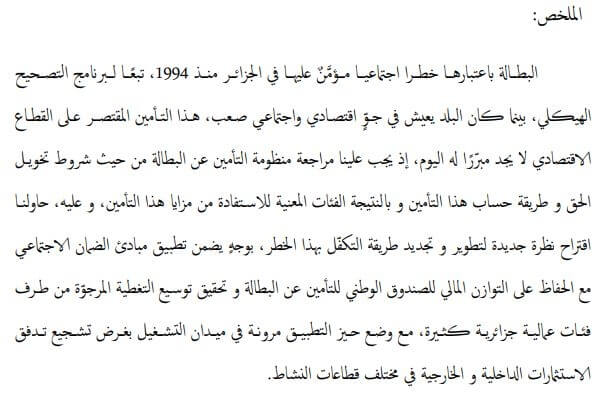 Pour cela, on a essayé de proposer une nouvelle vision qui développe et rénove la prise en charge de ce risque social, de façon d’appliquer les principes de sécurité sociale tout en préservant l’équilibre financier de la Caisse Nationale d’Assurance Chômage et réaliser l’étendu souhaité par une grande partie des travailleurs Algériens.