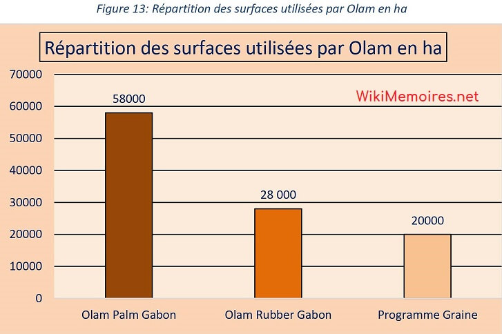 Olam, avec l’accord du gouvernement gabonais dispose de 300 000 ha pour la culture de rente et 200 000 ha pour la culture vivrière, soit 500 000 ha de forêt qui seront utilisés d’ici 2020 (NDJIMBI, 2018). Selon (MOUISSI, 2018), la valeur ajoutée créée par Olam serait de 3.6% du PIB nominal du Gabon et les activités d’Olam auraient contribuées à la création de 50% de la valeur ajoutée dans le secteur agricole.