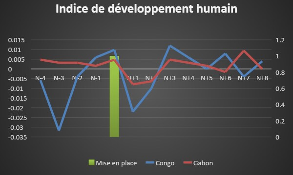 Pour ce qui est de la diversification, la tendance est décroissante pour les deux pays, donc après la mise en place des fonds souverains, les deux pays se sont de moins en moins diversifiés. Cependant, malgré une forte baisse de l’IDH un an après que le Gabon ait mis en place son fonds souverain, l’indice de développement humain s’est fortement amélioré pour les deux pays.