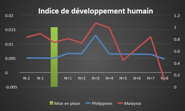 La tendance est similaire pour les deux pays sur toute la durée. Cependant, nous voyons qu’après la mise en place des fonds souverains, l’indice de développement humain s’est fortement dégradé pour la Malaisie alors que la tendance ne change pas pour les Philippines.