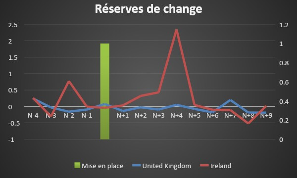 Les réserves de change du pays ayant mis en place un fonds souverain (Irlande) ont fortement augmenté après la mise en place du fonds souverain, puis ont baissé dramatiquement à partir de la sixième année. En parallèle, la dette a également fortement augmenté pour l’Iralande, mais aussi pour le Royaume-Uni qui a la différence de l’Irlande avait des réserves de change stables.