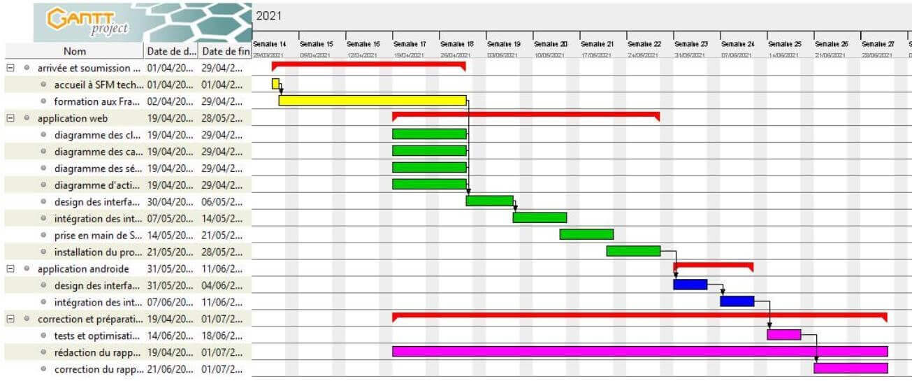 Nous avons par ailleurs aussi utilisé l’outil de planification des projets Ganttproject pour ressortir le diagramme de Gantt pour la réalisation dans le temps des taches de notre application tel qu’il suit :
