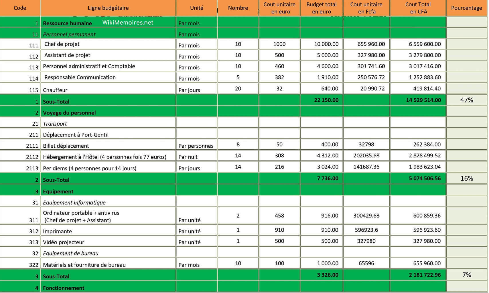 | Code | Ligne budgétaire | Unité | Nombre | Cout unitaire en euro | Budget total en euro | Cout unitaire en Fcfa | Cout Total en CFA | Pourcentage |