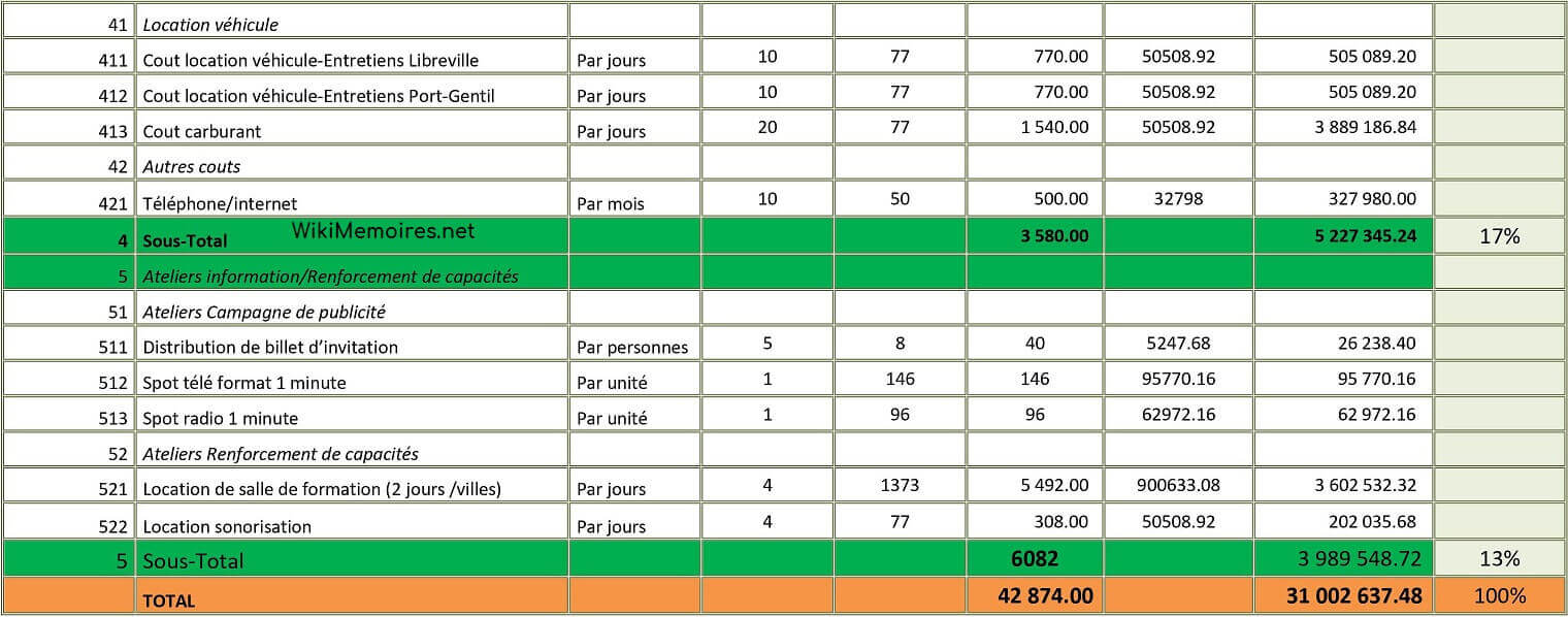 | 411 | Cout location véhicule-Entretiens Libreville | Par jours | 10 | 77 | 770.00 | 50508.92 | 505 089.20 | |