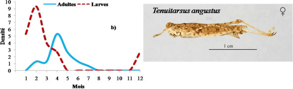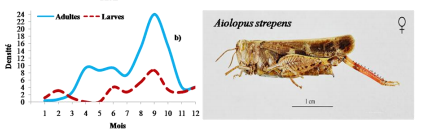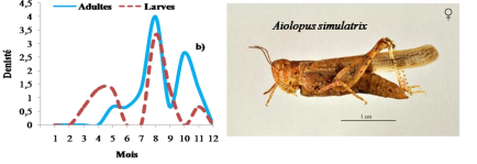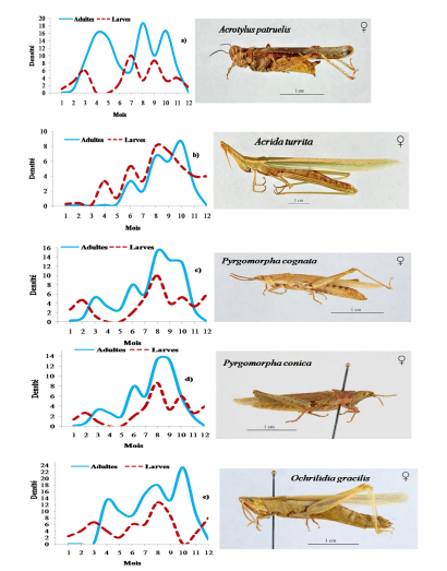 Aiolopus puissanti, Aiolopus strepens et Morphacris fasciata se caractérisent par la présence de deux pics de densité larvaire et imaginale ; les adultes et les larves de ces Acridiens ont été capturés toute au long de l’année. (Figure 19).