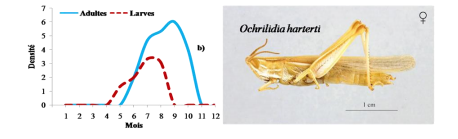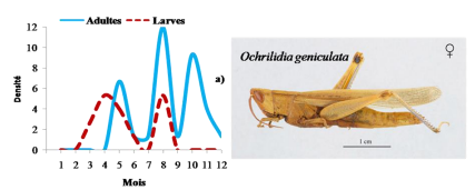 Figure 21. Evolution mensuelle des densités larvaires et d’adultes pour les espèces à deux générationsannuelleàhivernationembryonnaire:a)Ochrilidiageniculata et b)Sphingonotus rubescens, de la vallée du M’Zab.