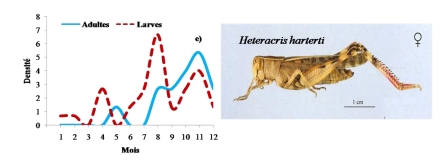 On note des pics de densité des adultes durant l’Eté chez les quatre Oedipodinae. Pour chaque Acridien la densité des larves augmente brutalement en mai et redescend.