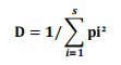 L’indice de Simpson ou indice de dominance prend en compte la fréquence mesurée des espèces. Ils accordent plus d’importance aux espèces les plus fréquentes qu’à la richesse spécifique totale (Magurran, 1988). Il est calculé selon la formule suivante :