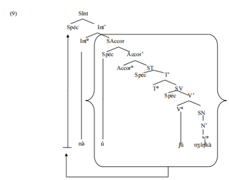 L’arbre ci-dessus représente la phrase (8) . Comme nous pouvons le constater, la plus haute projection de notre arbre est le syntagme de l’interrogation (SInt) . Il y a mouvement du syntagme de l’accord (SAccor) .